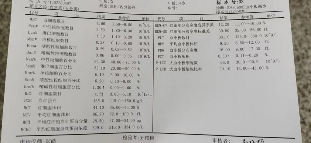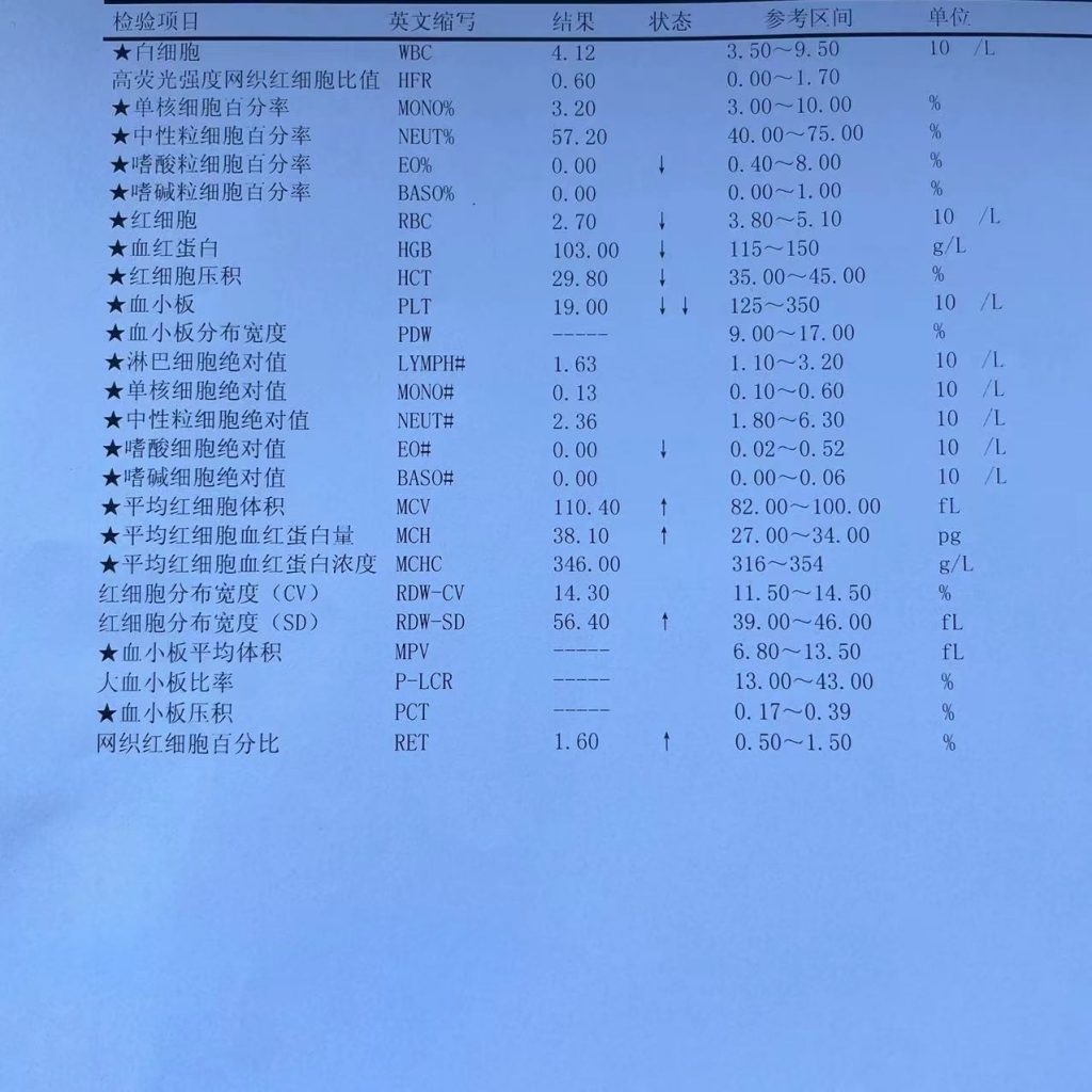 我永远记得19年的6月份,距离我生日还有一个月的时间!那是6月份的一天当时陪还是男朋友的老公去医院检查,当时心血来潮,想既然来了我也顺便做个检查吧,就是这一检查拉开了我原发性血小板减少的序幕!当时血小板检查出来是19×10^9/L(这个血常规上面正常值是:(100到300)×10^9/L.),当时医生就说怎么那么少啊,没有查之前我没有任何的不适,身上也未见血点,月经一般是6天,就第一和第二天量多,特别是第一天晚上,过了第二天晚上就开始减少。身上容易一碰就青一块紫一块,还有就是刷牙的时候容易出血,所以当时是一点意识都没有。