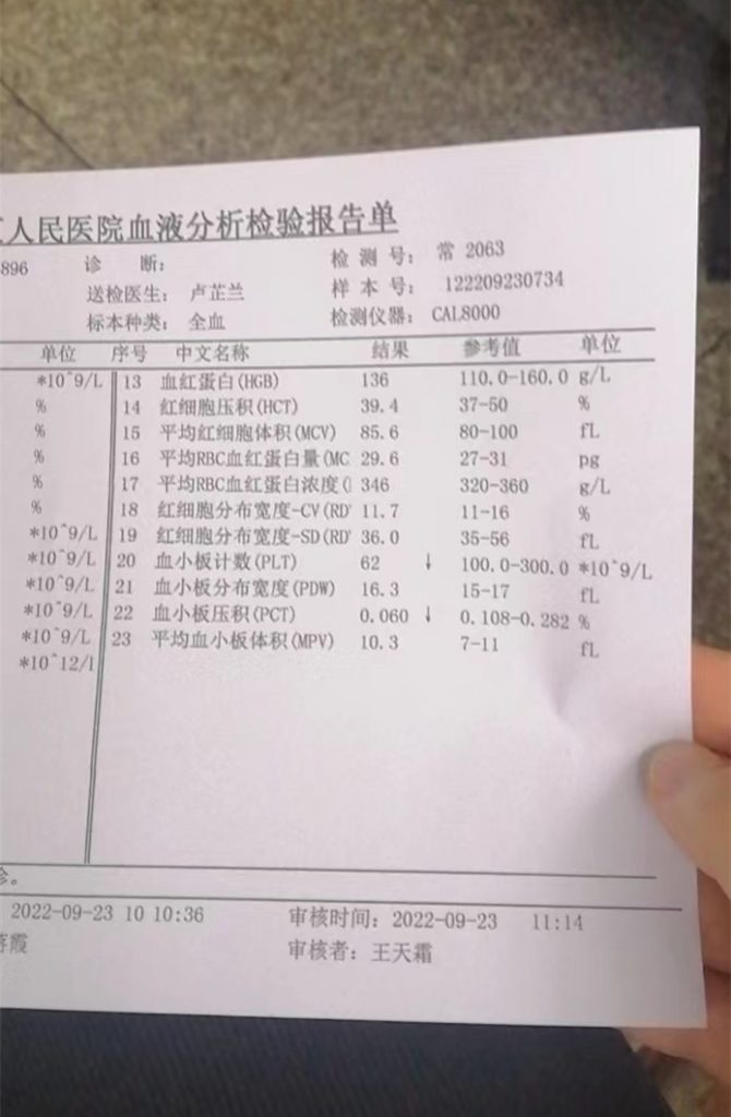 14、2020年8月24日,扬州苏北医院血液科管俊主任,诊断也是ITP,不知道是重感冒开始好转,还是利可君的奇效,血常规的值升的好快,白细胞5.3、红细胞5.01、血小板60。管主任问我吃了什么药,答复利可君片,管主任同样的、完全不相信利可君片的疗效,只是怀疑苏州的检测是否出了问题,要我立即停药,一星期后再去复检,看看真实的血小板指标到底是多少。
