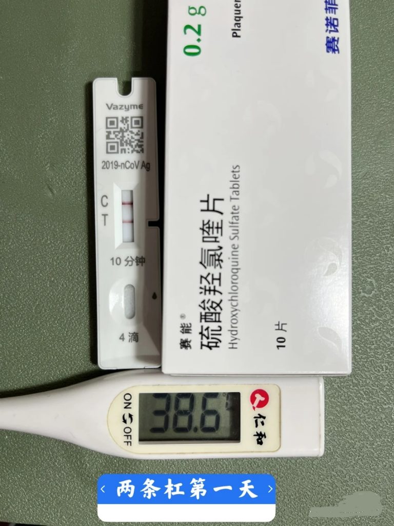 坐标北京,昨天有一些嗓子不舒服,不发热测抗原一直正常。今天10号白天嗓子不舒服,下午录了两个小时视频,嗓子不舒服加重。录完视频回家的路上,感觉脚踝、膝盖、屁股、腰部酸痛,此时有预感可能阳了。所以进家第一件事做抗原,不出意料两道杠。此时发热感不明显(也许是因为基础病原因经常发烧,因此比较不敏感),吃完饭过了一个小时开始感觉发热。于是开始洗漱,找药,准备饮用水,然后做做消杀工作到卧室量体温。