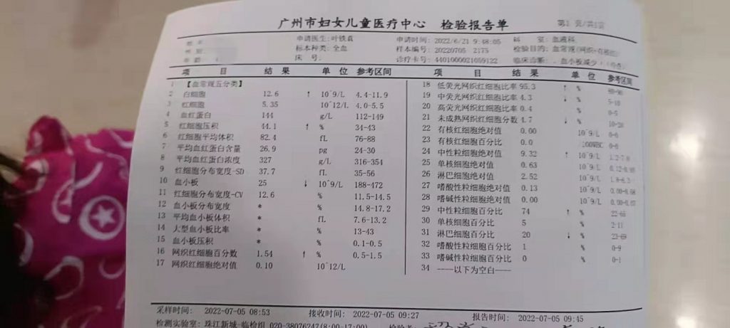 赶紧跑去做核酸要24小时以内的证明。心里哪个急呀!抱着孩子到处跑,终于在下午的四点结果出来了、马上开车赶往武汉协和医院,各种抽血检查。一看血小板掉到了只能8医生说这个是很危险的,要防止内出血和脑出血。看着孩子全身紫一块青一块的又听到这种消息。整个人都懵了、整整一天都没有吃饭,就为了到大医院好好治疗。后来医生给我开了六瓶丙球。再今天早上终于听到了好消息。血小板升到100多了,心里的石头终于放下了。历时五天终于好了。希望我的宝宝早点康复,健健康康的。也谢谢各位朋友的关心与祝福。