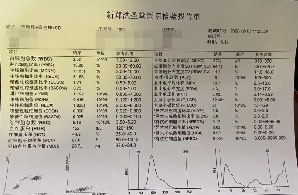 2018年2月下旬一个周末晚上,女儿与同学轮滑回来,洗脚时我发现她下肢有许多小红点,第二天一早上本市医院查血常规,血小板13。