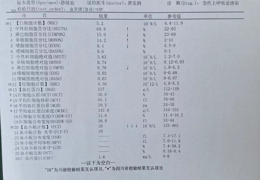12月27日我们一早发现不光身上淤青,嘴巴还有干裂血口子,但我以为是嘴巴是干的,脸上和白眼球有点状出血点,不放心打电话再次询问我老公是不是磕到脑袋之前磕青的地方了,我老公依旧回答可能是磕到了,然后我就去公司了。等我下午回来的时候发现脸上点状出血点更多了,我感觉到了问题的严重性,掰开嘴巴看了一下,发现宝宝牙龈也有出血点,有医学常识的我当时就有一种不好的预感,觉得血小板有问题,当即挂了私立医院号,去查了血小板,查完后医院给电话让再次复查,这时候我心里已经知道结果不好了,果不其然血小板只有9,就在血小板结果出来的时候,我家宝宝在医院出现了血便,随时都有颅内出血的可能,当时的心情我已经无法用语言来形容,以最快的速度让自己淡定下来,一路直奔儿研所,刚好晚高峰,路上堵车,儿研所门口那条路大家都知道,育儿嫂抱着孩子我们一路走到儿研所。进门右手急诊挂号,各种检查单还有核酸检测,等孩子输上液,已经19:30分了,入院前又一次血常规检查是19。