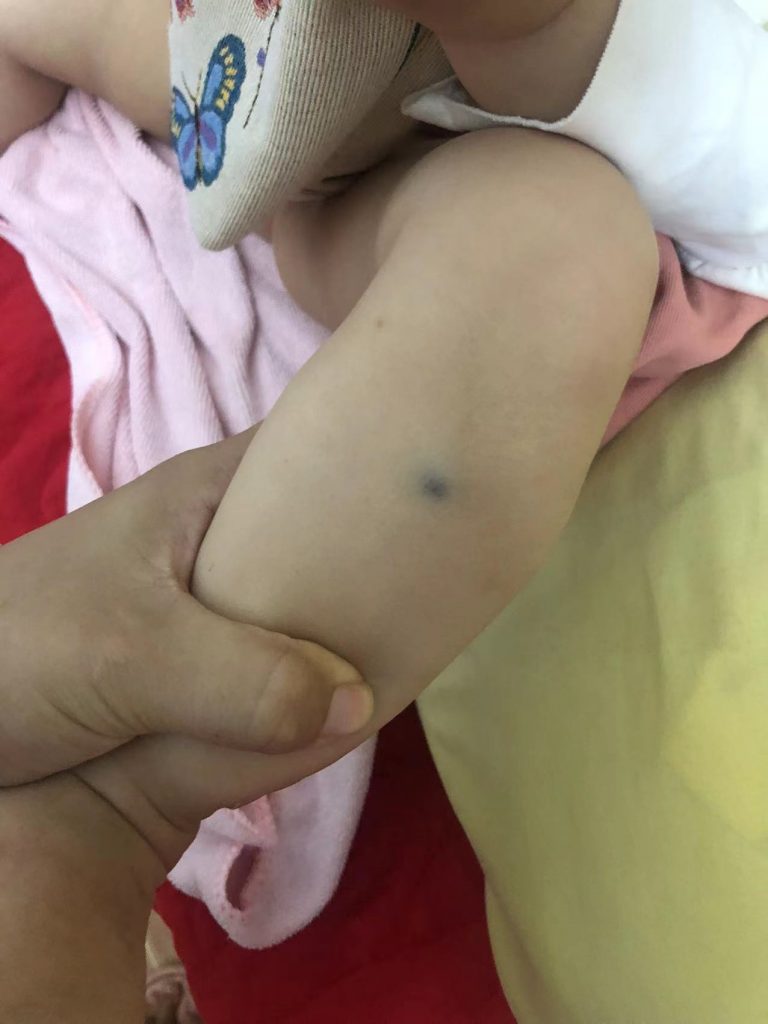 2021年12月25日周六育儿嫂休假一天,我老公出差回来在家和我一起看孩子,中午我炒菜让我老公看了几个小时宝宝,第二天早上育儿嫂休假回来给宝宝换衣服发现身上有瘀斑,同时前几天脑袋磕的淤青在已经快要消失的时候突然变严重,当时问我老公是不是磕着宝宝了,我老公回答可能是磕到了。