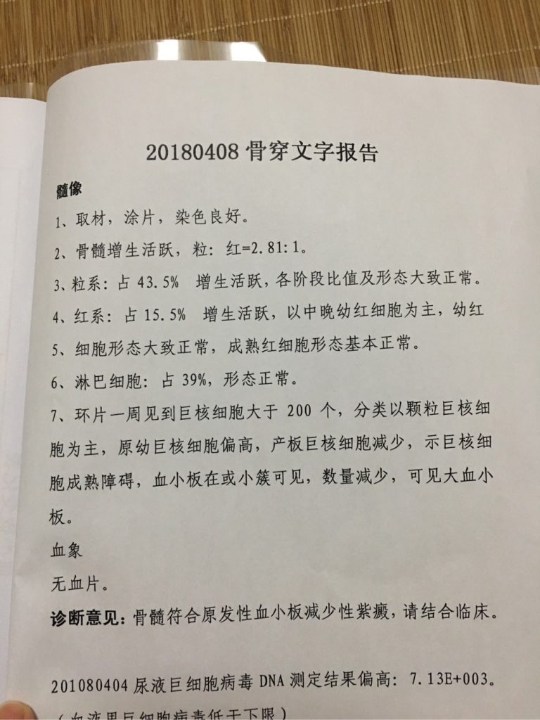 期间在医院做了很多检查包括各类病毒检测,都正常,先用丙球,每日10克,打了两天。骨穿取样取了两次才成功,每次那个医生带6到7个实习生,我宝宝成了小白鼠,哭的撕心裂肺,我的心也在油锅里煎熬,担心至极。