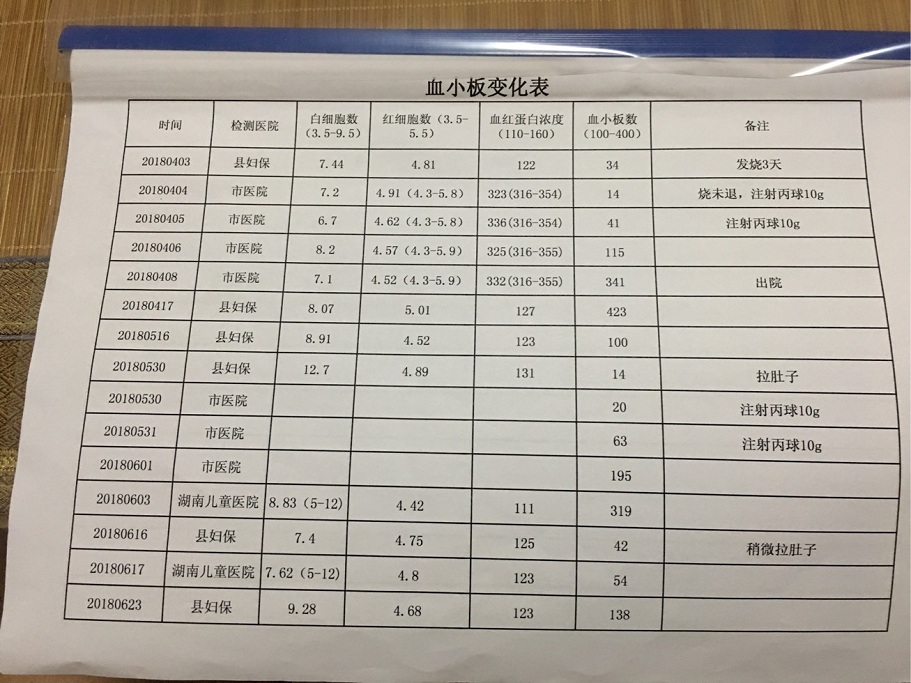 复查过血小板两次都正常,5月30日,突然发现四肢尤其是脚踝有很多陈旧性出血点,心当时坠入深渊,鼓起勇气复查,血小板又降至14,直接从县医院奔市医院,中间隔了2个左右小时,血小板在市医院的值是20,伴有严重的拉肚子,用丙球和蒙脱石散,6月1号复查血小板192,赶往湖南省儿童医院,6月3号,在湖南省儿童医院复查血小板319,医生开了一个月量的血康和槐杞黄颗粒,其他没交代。
