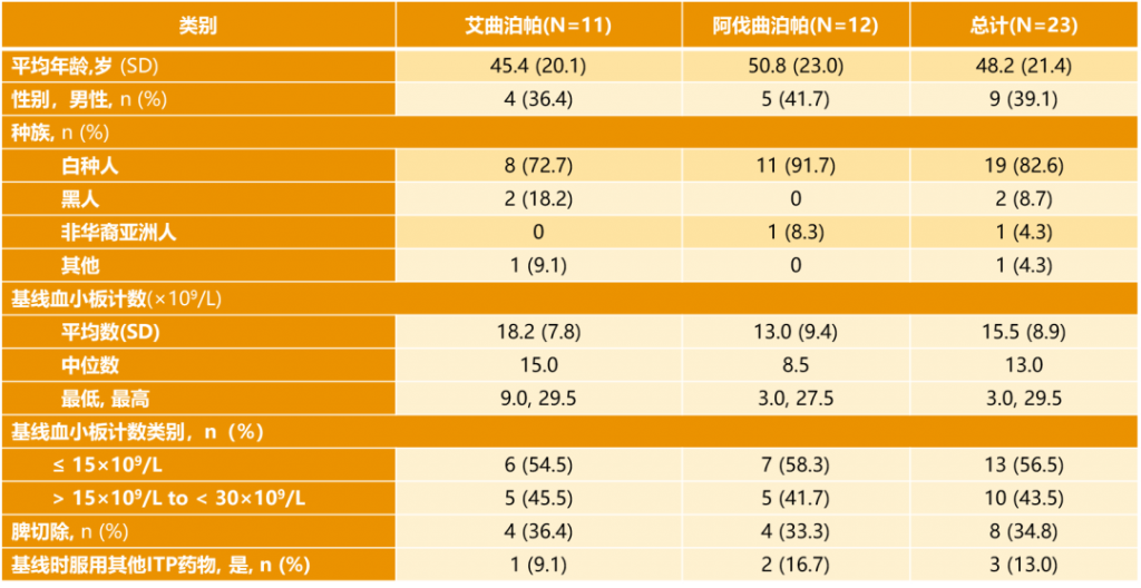 入组的受试者人数:阿伐曲泊帕组招募 12 人;艾曲泊帕组招募 11 人。