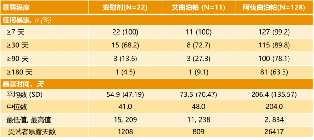 阿伐曲泊帕平均暴露时间 206.4 天,是艾曲泊帕( 73.5天)的 2.8 倍,安慰剂( 54.9 天)的 3.8 倍。