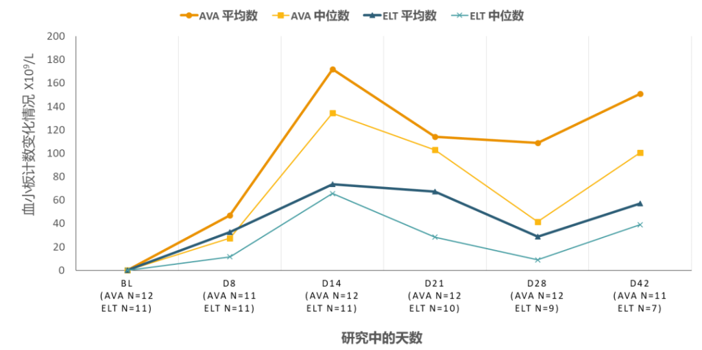 相比艾曲泊帕,患者服用阿伐曲泊帕血小板计数平均值起效更快,且 42 天内维持更高的血小板计数水平。