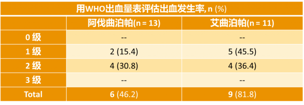 有趣的是,2 周后这些值都开始显示出阿伐曲泊帕具有更优的升血小板计数表现。由于第 8 周及其后的研究人群有限(第 8 周为 8 例阿伐曲泊帕和 4 例艾曲泊帕),因此未显示第 6 周后的数据。