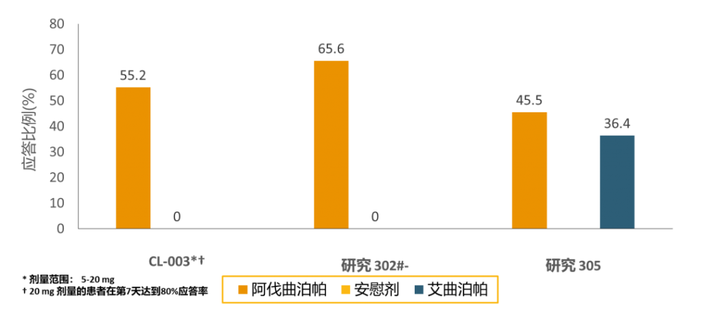 而在研究 305 中,阿伐曲泊帕应答比例为 45.5%,艾曲泊帕应答比例为 36.4%。