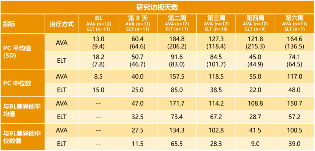 下表显示了阿伐曲泊帕和艾曲泊帕在每周访视的平均和中位数血小板计数以及较基线的变化。