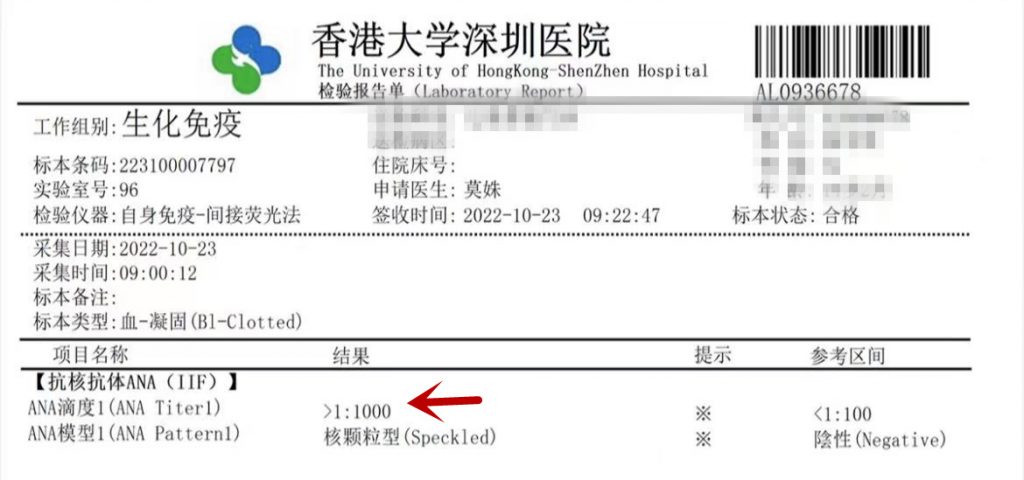 8月7日用美罗华整6个月,北京协和复查,血小板178*10/L,白细胞5.1410/L,血红蛋白136.00g/L。抗核抗体滴度1:320,RNP3217.5。自身免疫抗体SSA和RO-52均为阴性,免疫球蛋白A免疫球蛋白M偏低。肝功谷丙转氨酶62偏高。甲状腺球蛋白抗体148较高。IgG,IgA,IgM阴性,补体C3C4阴性。抗心磷脂抗体正常,抗B2-糖蛋白1抗体正常。B淋巴细胞CD19%为5.1%(5%–20%)升至正常范围,B淋巴细胞CD19为99(160–350)。