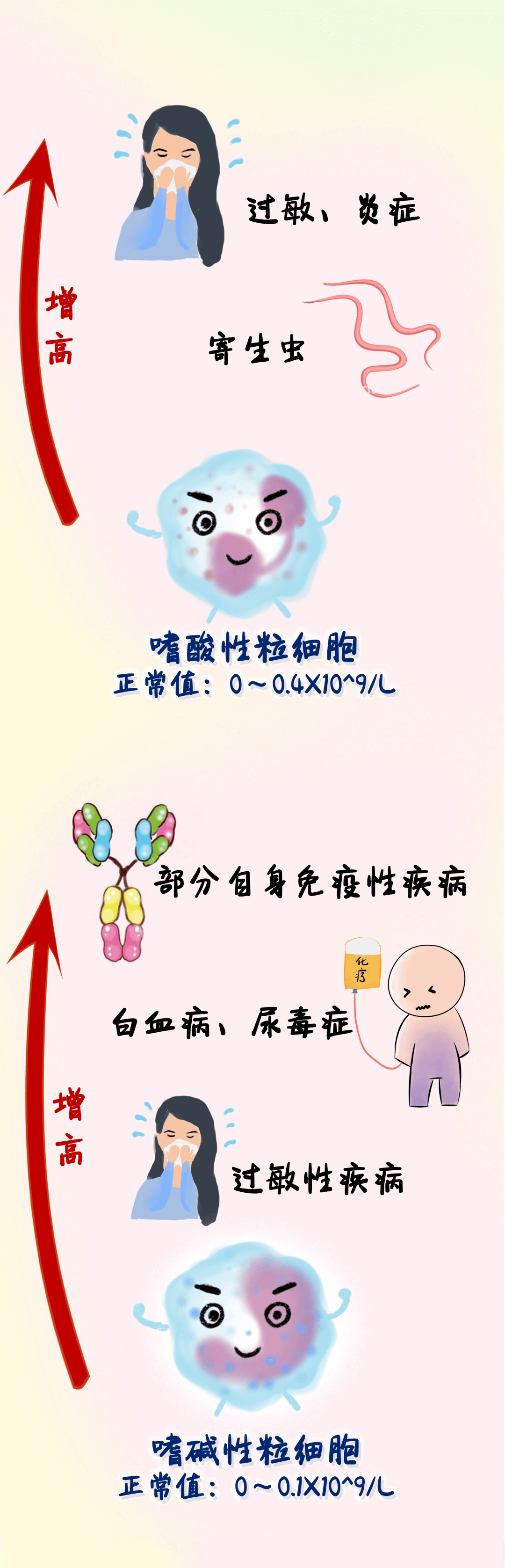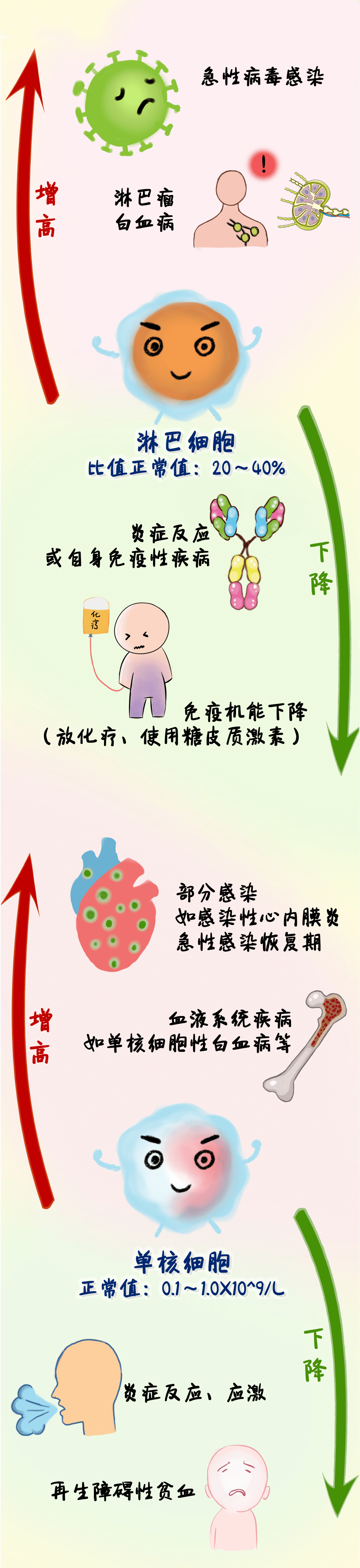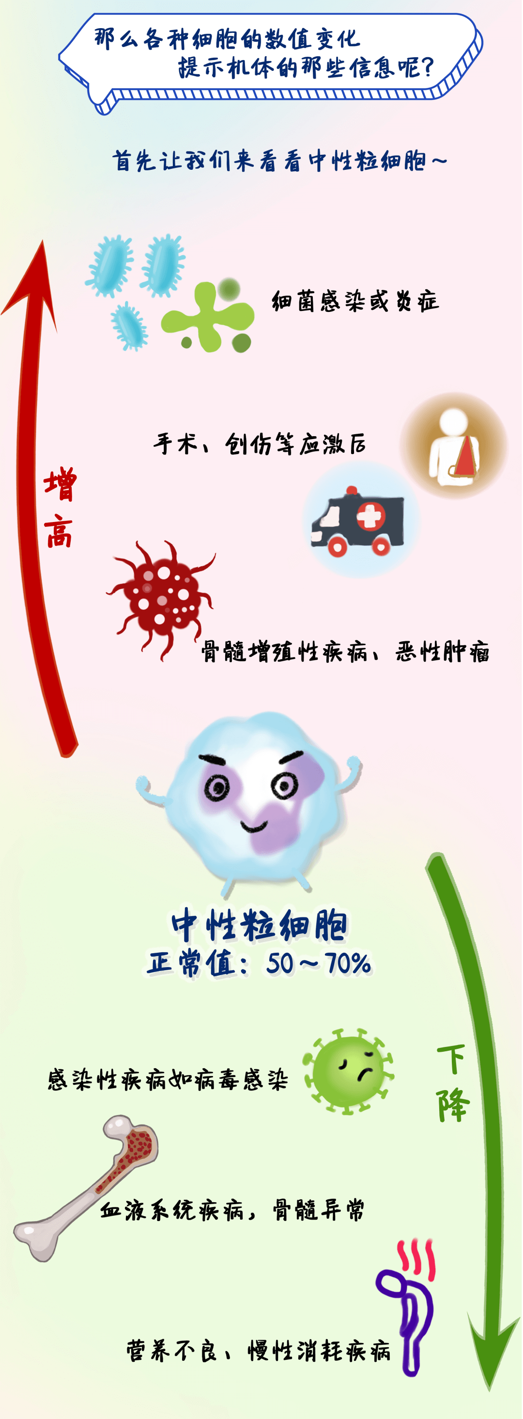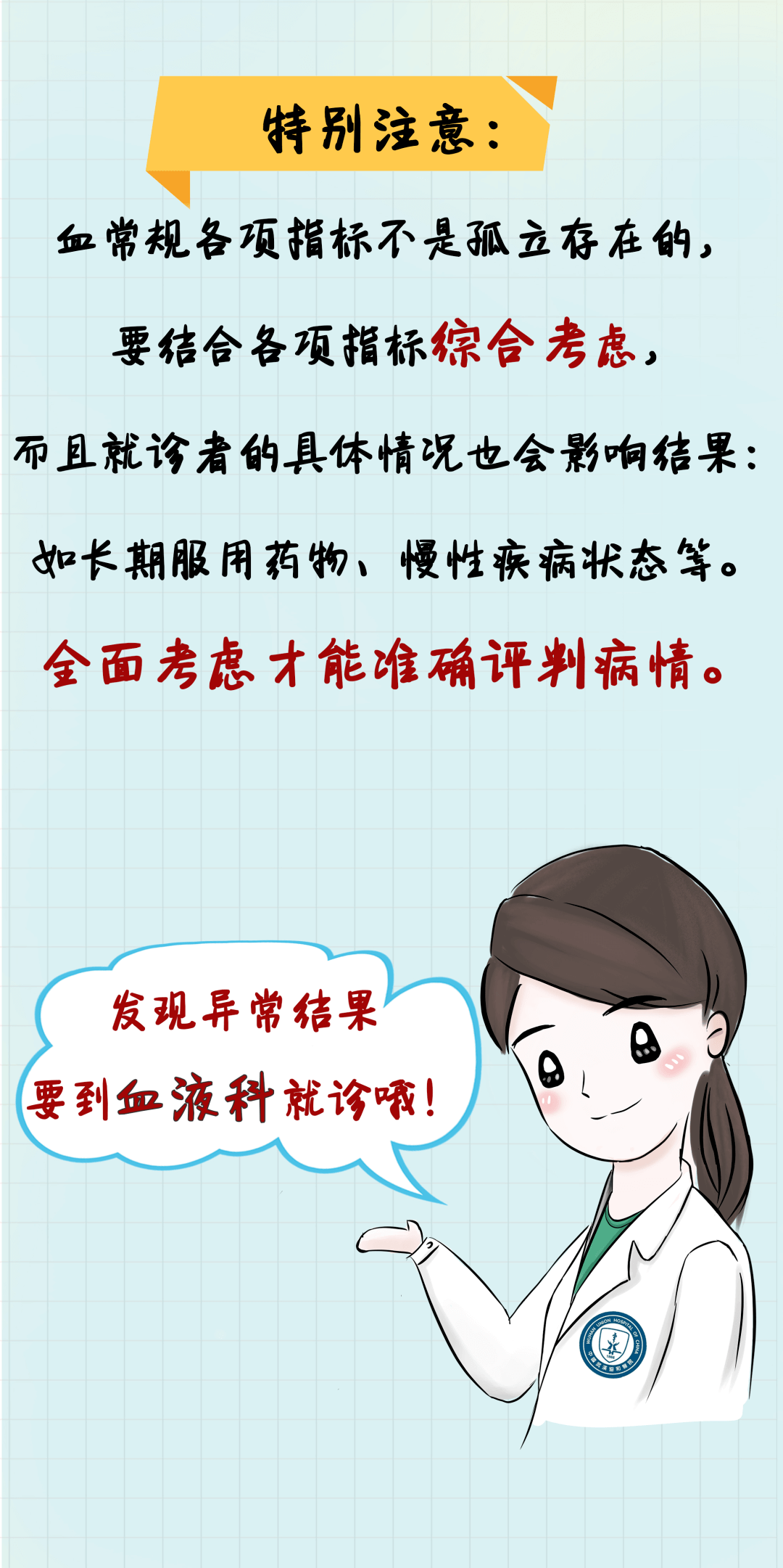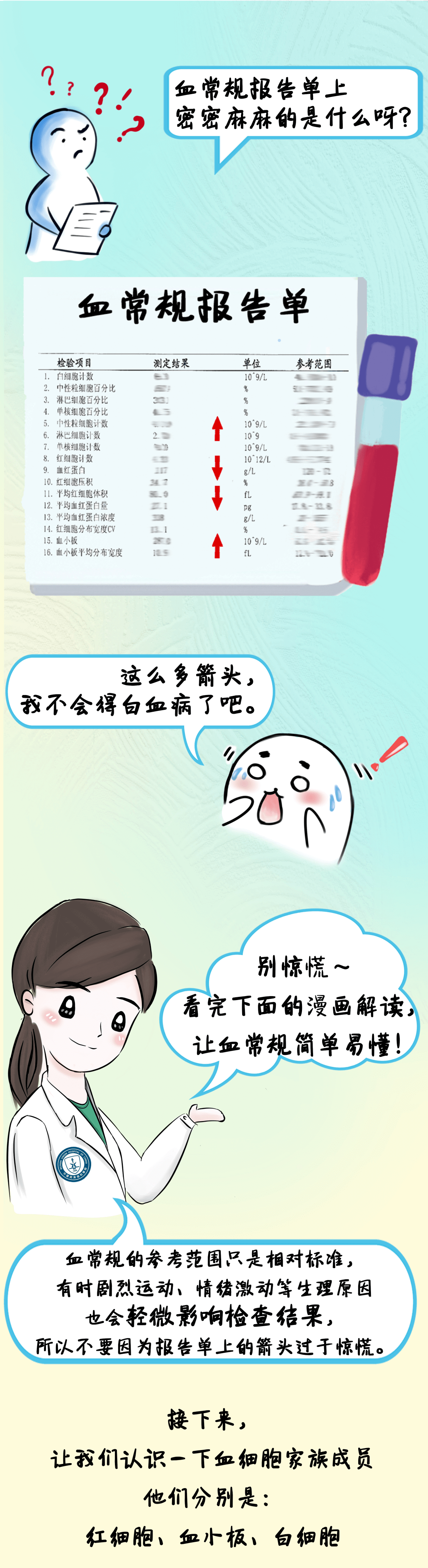 很多朋友在身体出现异样时,比如感冒、发烧、嗓子疼等等,无论是什么样的疾病去医院就诊时,医生通常都会让大家做“血常规检查”。特别是血液病病友,定期复查血常规对疾病的管理尤为重要。但很多病友并不了解什么要做血常规检查,也看不懂报告中有升有降小箭头↑↓和指数,那么,这些↑↓和指数究竟代表什么意思?下面,我们通过一张图,快速了解一下。