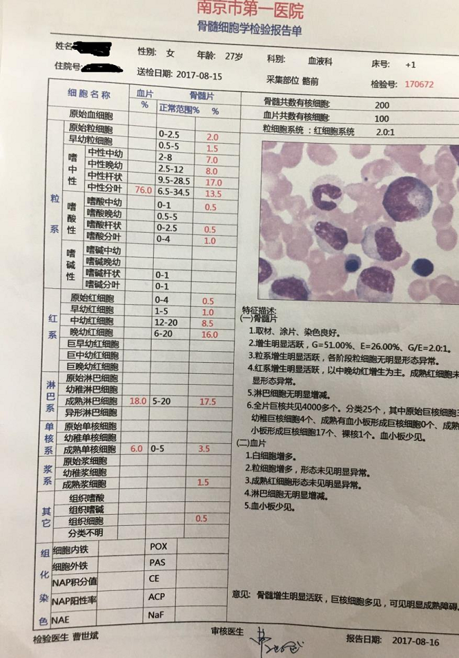 B 超显示没有脾大。在南京市第一医院住院期间做了骨穿,化验结果巨核细胞 4000.我表示震惊, 一般巨核细胞到二三百就比较严重了,再严重的能到五百,是我们的病严重到这个程度?医生化验错误?而且化验存在明显的程序错误,检验人和复核人竟然是同一个人!!!在南京市第一医院住院十天,输血小板 2 次,每次都能升高 6.但血小板最高也不过 12.住院期间极易感冒。