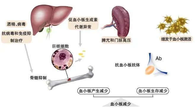 儿童血小板减少以急性ITP为主,多为病毒感染后的自然免疫反应。成人的病因除病毒感染外,还有饮酒、吸毒、输血、慢性肝炎、药物影响等因素的作用。