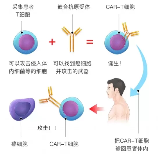CAR-T,全称是Chimeric Antigen Receptor T-Cell Immunotherapy,嵌合抗原受体T细胞免疫疗法。这是2012年左右就已经出现的一种癌症免疫治疗技术,但是近几年才被改良使用到临床上的新型细胞疗法,近期刚刚在中国上市。和其它免疫疗法类似,它的基本原理就是利用病人自身的免疫细胞来清除癌细胞。
