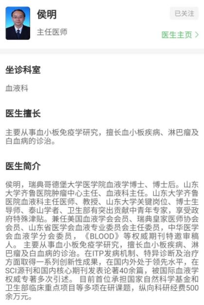 我托朋友问,在网上找黄牛,我家老爷子也托朋友问,没想到听到这个医院后都直摇头,说这个齐鲁医院血液科是出了名的难挂号,办法啊,为了亲娘啊,再难也要去啊。我当时都想好了,到了我就推门进去,直接给侯主任跪下,不给看不起来 ,结果去了后发现现场其实是可以在分诊台挂紧急号的,分诊台的护士态度也不错,给我们加了号。见到这个候明主任的时候,他一点也没有那种名医的架子,反而对原来的治疗方案嗤之以鼻,我不学医,所以不多评论了。后面就顺多了,给我们开了住院条让去办理住院,这里有个小插曲,在住院部办理住院的时候,工作人员还说没床位,我把住院条递过去,结果工作人员说了一句,“侯主任的病人啊,有床位。”哈哈,我母亲现在状态恢复的很好,去年一年都没有再犯过病了,感谢山东齐鲁医院,感谢血液科的侯主任和一个王姓女大夫,好像是叫王琳,我一直喊人家王大夫,尴尬 特别提一句,这个王主任也是相当的厉害,应该是侯主任的徒弟之类的,哈哈附上候明主任的介绍。