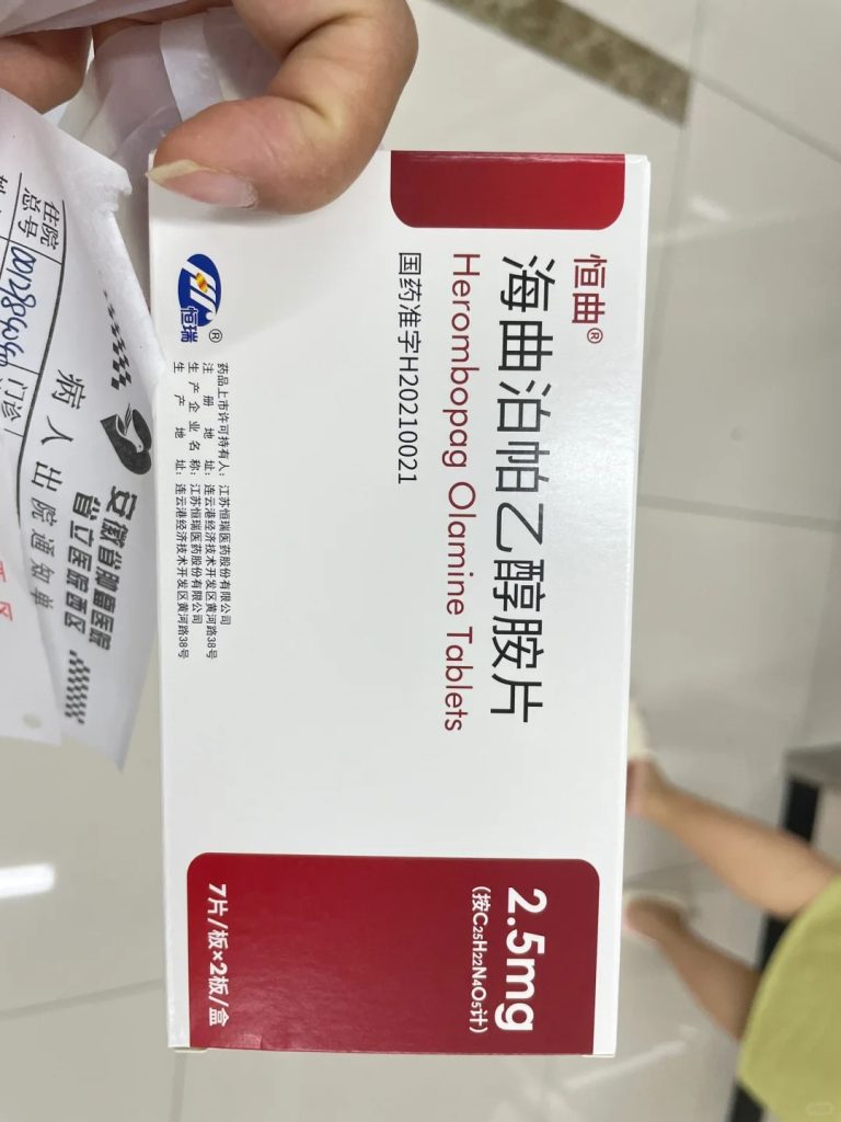 1.我妈妈是1号时身体出现紫癜,淤青,同时也是高血压血糖患者,那时候在我们市医院查了血小板只有3,就转急诊到广州中山大学附属第一医院,后面检查后就也确诊ITP,当时也是用了恒曲海曲泊帕,一盒1700多。还不给报销。当时那个血液科的老油条医生(感觉她愧对医生教授这个称谓)