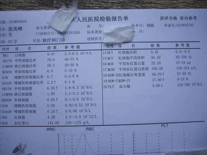 主任拿出一张报告单,严肃的对他说:“刚才检验科给我打电话,说有一个特别异常的报告单,就是你的,你看,正常血小板血液中数量为10万至30万每立方毫米,可你呢,只有五千,以防万一有操作失误,我们准备给你再抽一次血。”