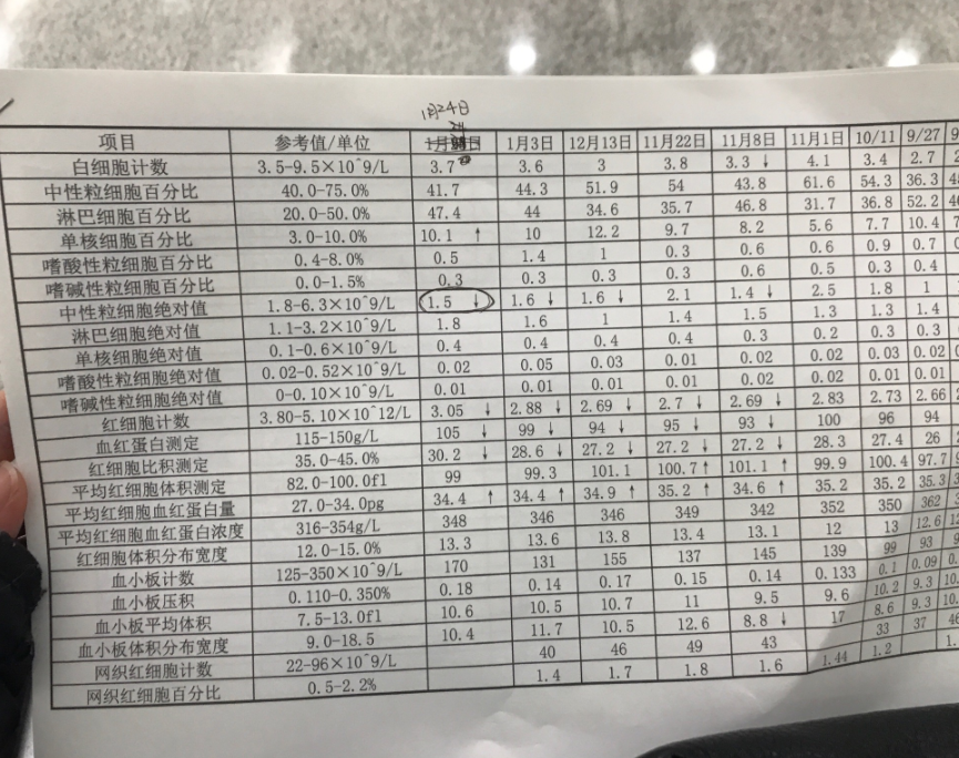 好久没更新了,这是最近的。都是起起伏伏,最近中性粒细胞一直偏低,人容易累,老犯困。红细胞终于开始涨了。