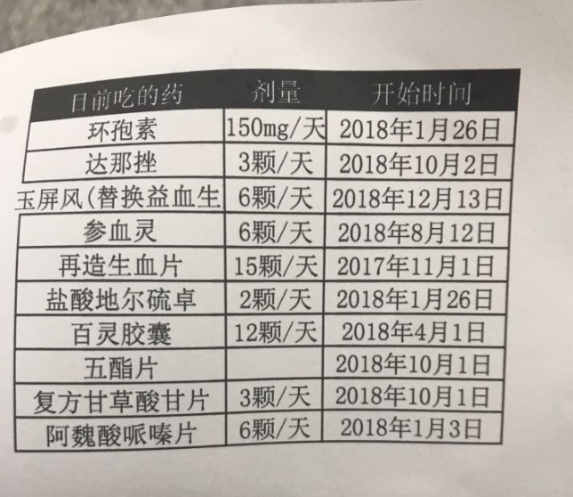 目前情况,2017年7月左右发现血3系偏低,11月做两次骨穿,两次情况不太一样,一次是再障的表现,一次是mds的表现,不能确诊,2018年2月左右确诊,开始吃环孢素,从2月到5月,由于吃环孢素的原因,免疫力下降,多次感冒发烧,咽炎,血象并未好转,5月住院复查骨髓,主任医生让继续吃环孢素,加了一个中成药百令胶囊。后来白细胞逐渐正常,但是经常波动。6月初将环孢素改成进口的,血小板开始有所上升。