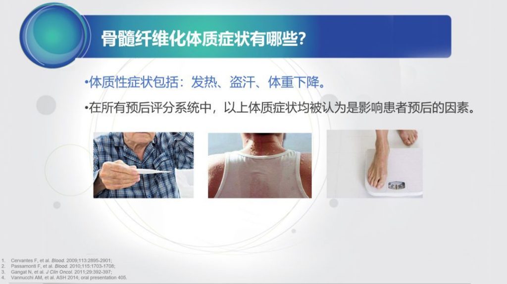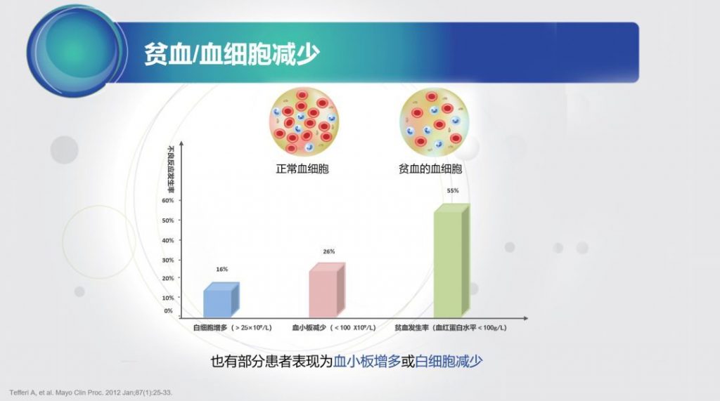 中国骨髓纤维化患者病情是什么特点呢?相对来说病情比较重,这一群病人里面78%的患者是原发性骨髓纤维化,22%的患者是继发性骨髓纤维化。继发性的骨髓纤维化是继发于真性红细胞增多症,或者是继发于血小板增多症。中国的患者在就诊时大多数已经是处于一个中危或者高危的阶段。50%的患者脾脏大小为肋缘下15CM,而且大部分是有脾肿大的症状。50%的患者在就诊的时候出现了贫血的症状,血红蛋白水平是小于99g/L的。