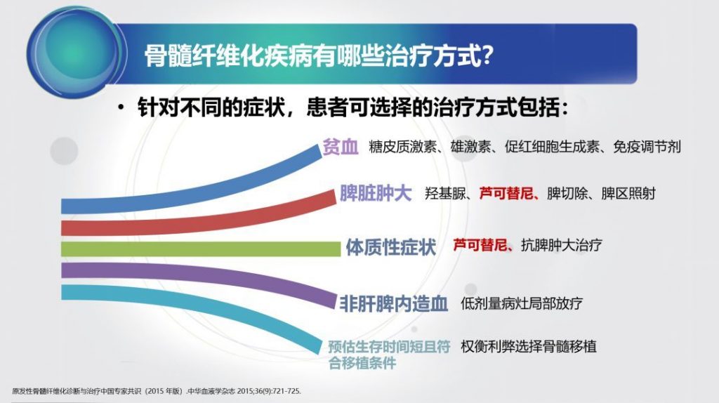 目前的观点认为造血干细胞移植是唯一可能治愈骨纤的手段,包括异基因骨髓及外周干移植,一般以异基因为主,年龄40岁以下的急性骨髓纤维化病人,应早期行骨髓移植。部分移植成功后骨髓纤维组织消失,且不受纤维组织增生程度的影响,但与移植相关毒性应充分考虑。患者年龄及健康评估同样是重要的影响因素。传统治疗方法能改善病情,但不能缩短病程,包括羟基脲、雄激素、泼尼松、红细胞生成刺激因子及达那唑等,有报道低剂量沙立度胺联合泼尼松能使30%-50%患者的贫血及血小板减少症得到纠正。伊马替尼也在被使用,但其疗效是有限的。目前,有关的靶向治疗药物(JAK2激酶抑制剂)正在临床试验阶段,希望能有预期的疗效,能给患者带去福音。