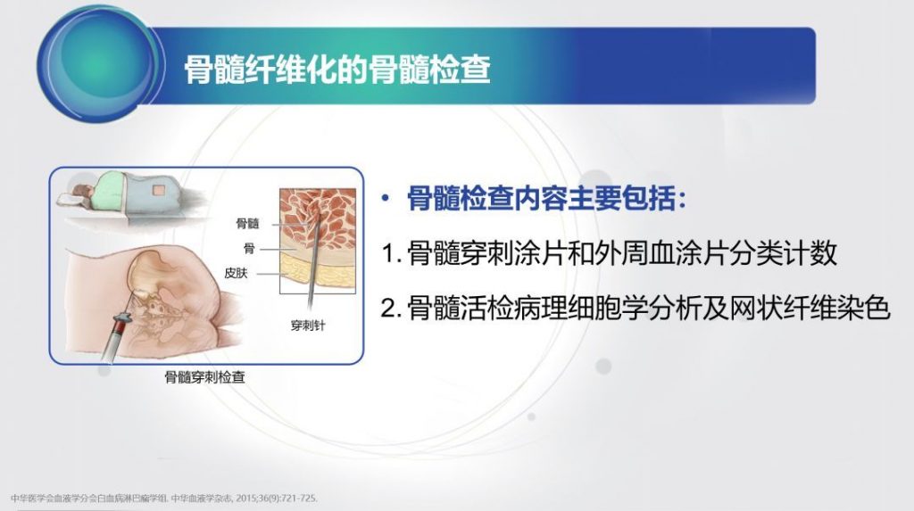 一般而言,患者若到专科门诊就诊,血常规检查是第一步的。不少患者在早期血象可以是正常,甚至血色素轻微升高;约1/2-1/3的患者表现为正细胞低色素性贫血,网织红细胞同样可以轻度升高。通过观察血涂片,有时可见到泪滴状、椭圆形或靶形红细胞,但这并不是骨纤的特异性表现。若血常规无法明确诊断,一般应该及时给予骨髓及活检检查,该方法相对于单纯验血具有指导意义。当见到骨髓网状纤维、胶原纤维增多(早期可无),巨核细胞、粒细胞的增殖活跃及红细胞生成减少,一般就能确诊。此外,研究发现50%的患者存在着JAK2基因突变,5%-10%骨纤存在着MPL 515位密码子变异,通过检查染色体基因也能在一定程度上帮助诊断。
