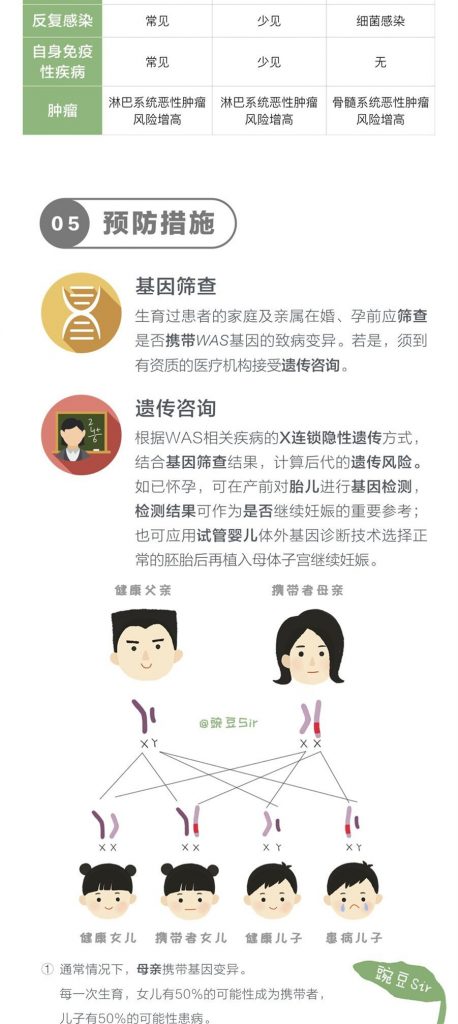 WASP基因为Wischott-Aldrich综合征(血小板减少伴湿疹、免疫力低下综合征)相关致病基因。为X连锁隐形遗传。本例患者检测发现在10号外显子编码区域1325-1326位插入碱基A,c.1325-1326insA,改变异造成氨基酸移码突变,p.I442fsX52,导致蛋白编码提前终止,可能引起所编码蛋白质的结构和功能的改变,请结合临床资料分析,建议查父母基因。