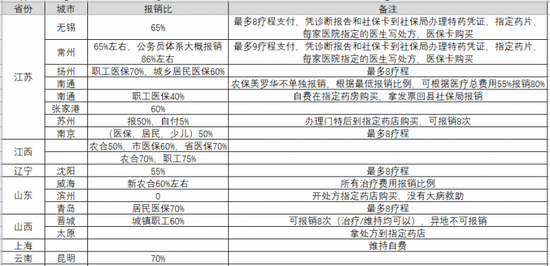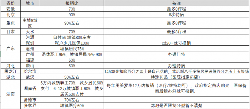 美罗华报销地区:(没有提到的不一定就不报销,只是可能没收集到,大家一定要问医生,医保局)