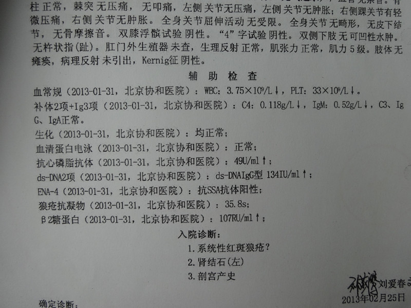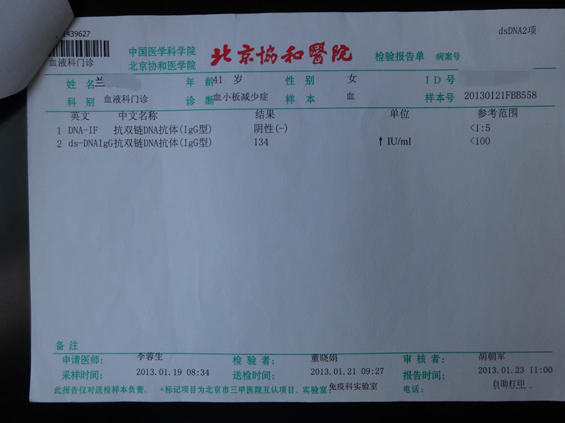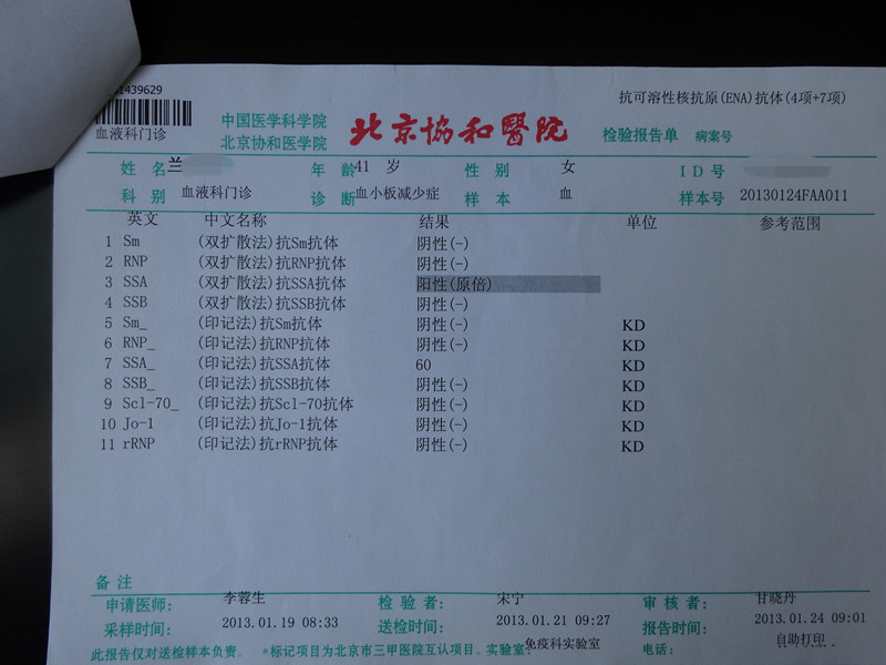 2013年的1月18日,我去协和血液科了,看病的是一位六七十岁的老医生,详细问了病情后,又问我有没有过脸上怕晒?口干舌燥等问题,我问她,您怀疑我是SLE?她说有这种可能,你做进一步的检查吧。她给我开了全细胞血分析、dsDNA2项,抗核抗体谱3项、抗可溶性核抗原(ENA)抗体(4项+7项)、肝全+肾全的化验单。