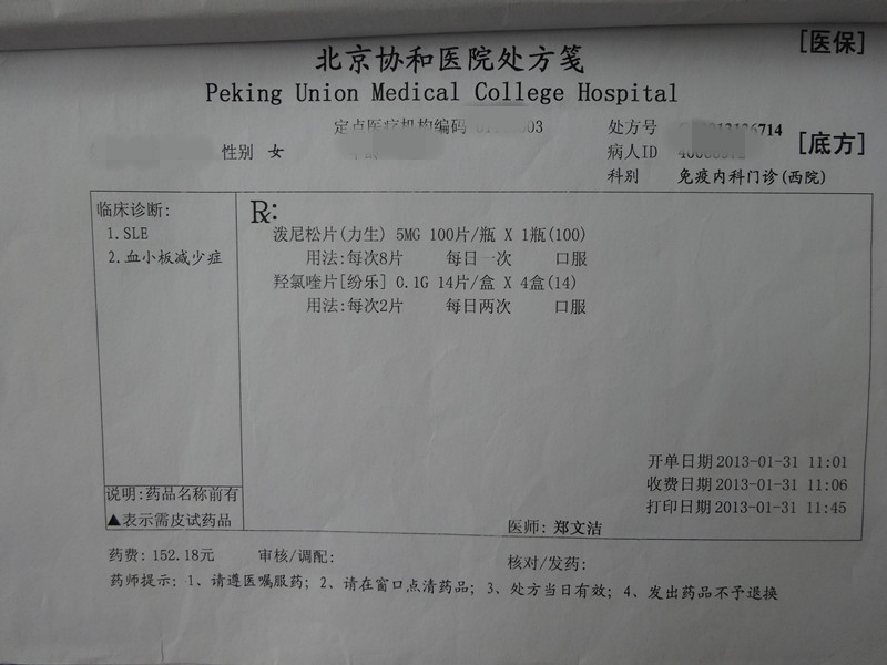 协和免疫内科的号根本挂不上,多亏一个同事帮了我,使我能够于2013年的1月31日去协和西院的免疫科见医生。