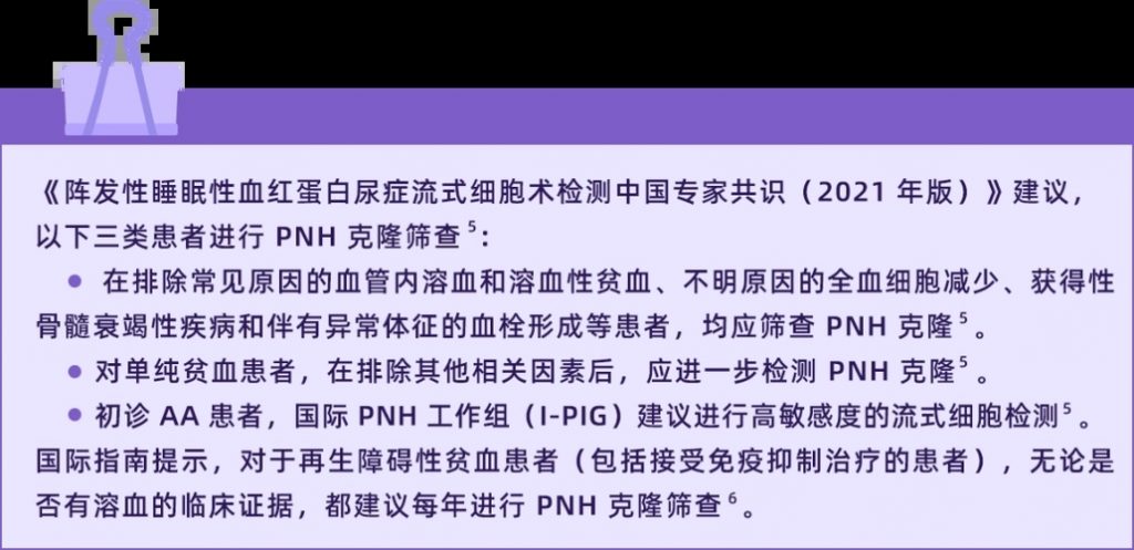 目前,PNH是通过流式细胞分析来确诊的,其可确定特定RBC或白细胞细胞表面蛋白(CD59和CD55)的缺失。该检测的灵敏度和特异性均很高。