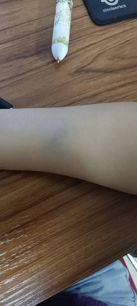 腿部和手都有很多淤青,嘴里也会有出血点,但还好没有流血